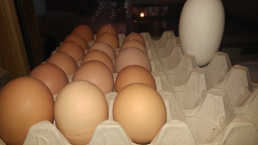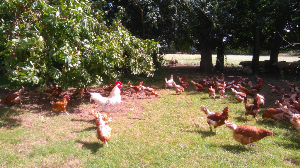 På gården er der en lille besætning af Isa warren høns, som er rigtig gode til at lægge mange æg.De kommer på græs så meget som muligt, så blommen kan få den rigtige farve og smag.Forår, sommer og efterår har vi altid helt friske landæg. Om vinteren kan hønsene ikke følge med. de lægger færre æg, samtidig med at det er højsæson i gårdbutikken op til jul.