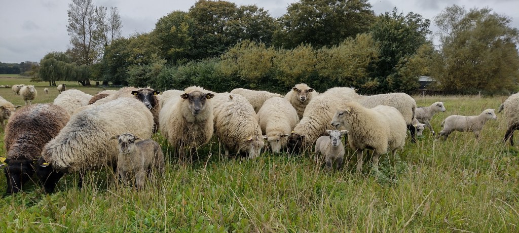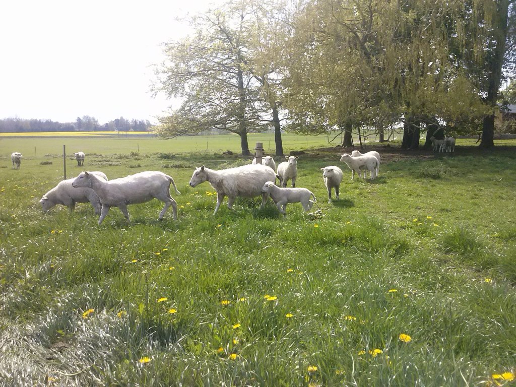 | Fårebesætningen består af moderfår af racerne Gotlandsk pelsfår, Leichester og Dorset Vædderne er af racen Texel.I oktober måned bliver vædderne sat til Gotlænder og Leichester fårene og i juni måned til Dorset fårene.I løbet af 1-2 måneder er alle får ilemmede. 147 dage senere i marts – april og i november – december kommer de første lam. De vejer mellem 2,5 og 6 kg ved læmning og mellem 50 og 60 kg ved slagtning.I marts april kommer lammene på græs få dage efter læmning. Her går de lige til slagt i oktober november måned. Lammene lever af modermælk, frisk græs og en smule korn.I oktober november bliver lammene på stald til græsset begynder at gro. I staldperioden lever de af modermælk, hø og korn. |