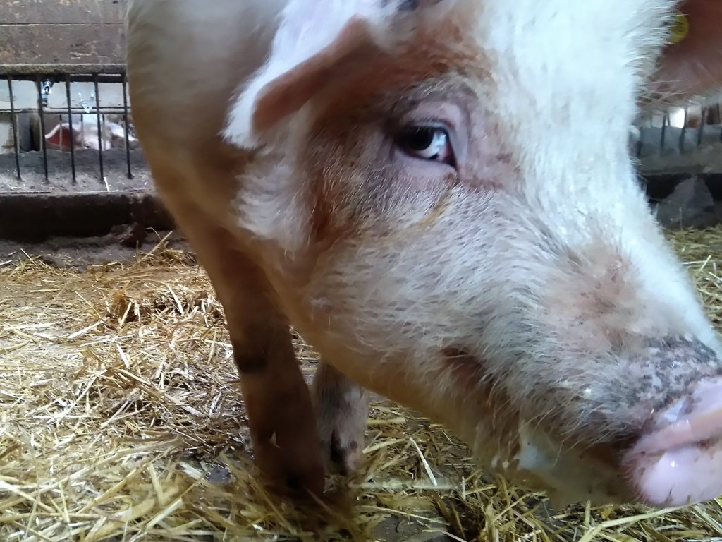 | På gården er der et lille hold grise. Vi får dem fra en lokal svinebesætning når de vejer ca. 25 kg. Når grisene er omkring et halvt år gamle vejer de ca. 110 kg og er nu klar til slagt. Slagtevægten er ca. 80 kg. Det er lidt større end normalt og det giver en meget bedre smag. Vores grise er aldrig fede.Grisene går i den gamle svinestald, hvor der er fast gulv, god plads og masser af halmstrøelse. Grisene lever af korn, grøn antonius tilskudsfoder og hø og halm. Om efteråret får de desuden store mængder af frugt og grønt fra haven. |